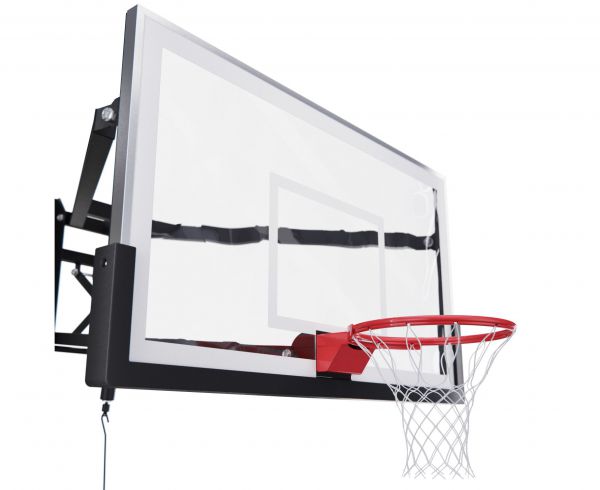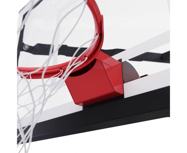Щит изготовлен из прочного закалённого стекла толщиной 12 мм — материала, обеспечивающего отличный отскок мяча и устойчивость к ударам. Его размеры — 180 х 105 см, что делает его максимально приближенным к профессиональному оборудованию. Регулируемый вынос щита (98-116 см) повышает безопасность и удобство во время игры. Дополнительную безопасность обеспечивает защита Poly Pade, установленная по нижнему краю щита.