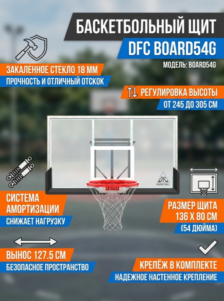 Баскетбольный щит DFC BOARD54G для установки на стену. Щит сделан из закалённого стекла, кольцо R3 оранжевого цвета диаметром 45 см. Вынос щита - 127,5 см вместе с кольцом.