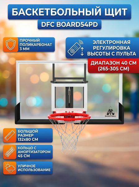 Баскетбольный щит с автоматической регулировкой высоты DFC BOARD54PD. Это первая модель с возможностью электронной регулировки высоты. Чтобы изменить уровень, достаточно нажать кнопку на пульте. Высота регулируется в диапазоне 40 см.
