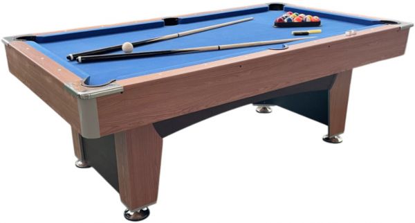 Размер игрового поля составляет 188 х 92,5 см, что обеспечивает комфортное размещение шаров и свободное перемещение кия. Игровая поверхность выполнена из МДФ с покрытием ПВХ и бархатным сукном, что гарантирует долговечность, ровный ход шаров и приятное ощущение при игре. Толщина игрового поля — 18 мм, высота бортиков от поля — 36 мм, а их толщина — 12 мм, что обеспечивает стабильное отражение шаров при столкновениях.