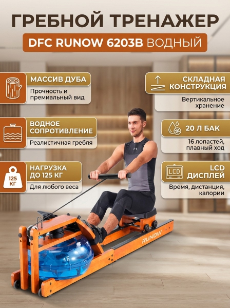 Гребной тренажер DFC Runow 6203B выполнен в цвете оранжевый дуб и предназначен для пользователей весом до 125 килограмм. Тренажер компактен и может быть установлен вертикально у стены.