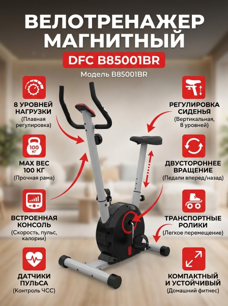Велотренажер DFC B85001BR серо-красного цвета - для тех, кто хочет заниматься спортом в домашних условиях. Вертикальный велотренажер предназначен для тренировки ног и ягодиц, а также для улучшения кровообращения. Он имеет максимальный вес пользователя до 100 килограммов и оснащен маховиком весом 4 килограмма.