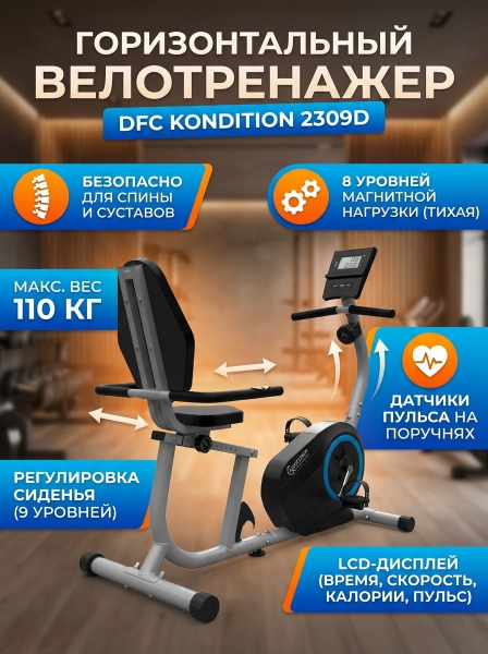 Горизонтальный велотренажёр DFC Kondition 2309D предназначен для поддержания физической формы и улучшения здоровья. Максимально допустимый вес пользователя до 110 кг.