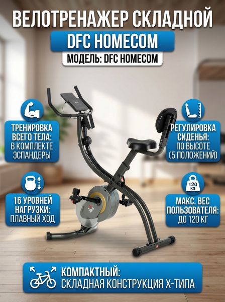 Велотренажер DFC Homecom - это удобный тренажер для дома, который позволяет тренировать мышцы ног и сердечно-сосудистую систему. Максимальный вес пользователя составляет 120 кг. В комплекте с тренажером идут эспандеры, которые позволяют дополнительно работать с мышцами рук.