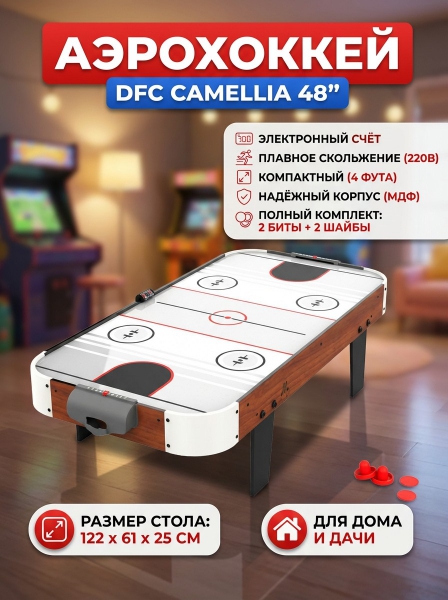Аэрохоккей DFC CAMELLIA 48” - компактная настольная модель. Стол отлично подходит для активного отдыха, его легко взять с собой на дачу или в поход. В комплект входят электронный счётчик очков, 2 биты и 2 шайбы. Вентилятор работает от сети 220 вольт.