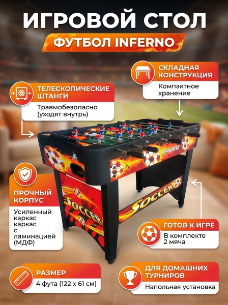 Игровой стол-футбол DFC Inferno SB-ST-29398S для домашнего использования. Боковые стороны из МДФ ламинированным ПВХ высотой 19,5 см и толщиной 12 мм. Стороны со стороны игроков высотой 19,5 см и толщиной 9 мм. Телескопические стержни диаметром 13 мм с хромированным покрытием.