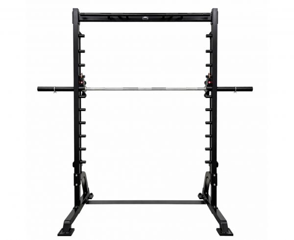 Модель рассчитана на максимальный вес пользователя до 120 кг. Тренажёр оснащён грифом для приседаний, который перемещается по направляющим и фиксируется с помощью ограничительных кронштейнов безопасности, расположенных сверху вниз по всей высоте конструкции. Для надёжной фиксации весовых блинов предусмотрен пружинный зажим.