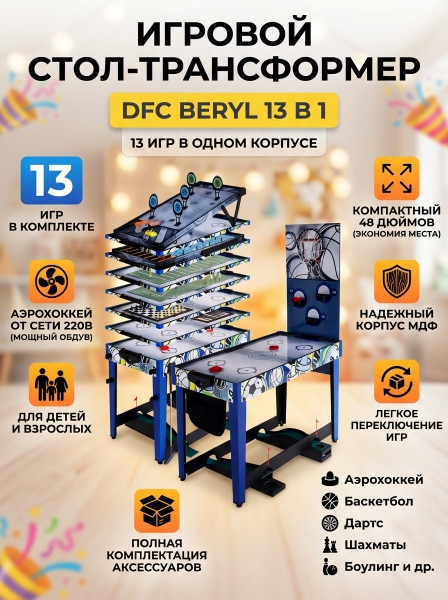 Игровой стол-трансформер DFC BERYL 13-in-1, размером 48" (дюймов), представляет собой целый развлекательный центр, который превращается в 13 различных игр. Вентилятор, работающий от сети 220В, обеспечивает плавное скольжение шайбы аэрохоккея по игровому полю.