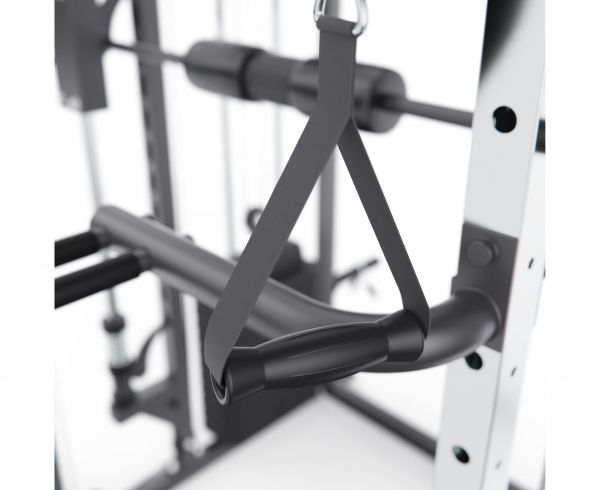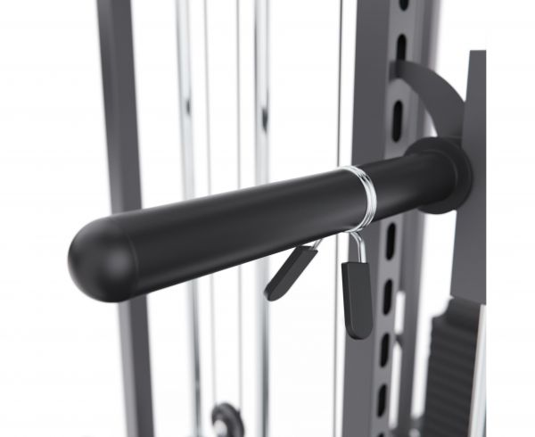 Тренажёр оснащён верхними и нижними блоками, а также набором рукоятей: прямая, V-образная, манжета для ног и дополнительные адаптеры. Система тросов использует тросы длиной 60 см и диаметром 5 мм, оснащённые пружинами и фиксаторами, что обеспечивает плавный ход, точную регулировку нагрузки и долговечность в условиях интенсивной эксплуатации. На стойках расположены держатели для весовых пластин, а встроенный гриф имеет длину 80 см и толщину 5 мм, что обеспечивает удобную загрузку дисков и стабильную работу при выполнении упражнений.