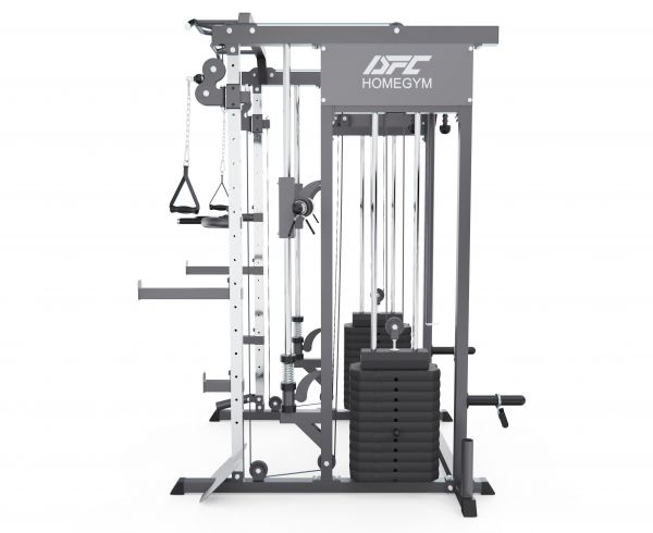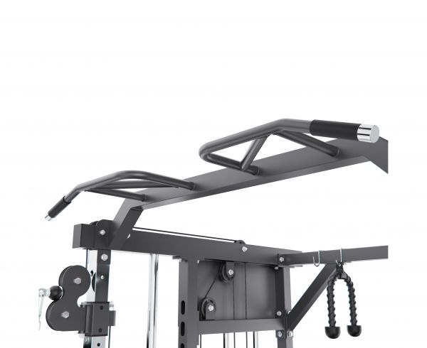 Тренажёр оснащён двумя блоками кроссовера, каждый из которых имеет вес 72 кг, что позволяет точно регулировать нагрузку и эффективно прорабатывать различные группы мышц. Отдельно предусмотрены амортизатор и весовой диск, упор для ног и поручни, что позволяет выполнять тяги, жимы, приседания, проработку спины, рук и корпуса. Турник с широкой перекладиной даёт возможность выполнять множество упражнений на верхнюю часть тела.