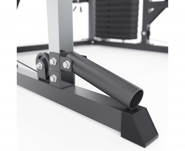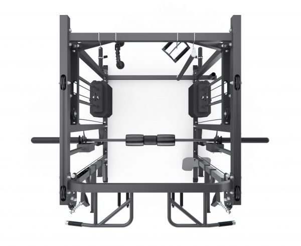 Конструкция объединяет прочие элементы рамы, балки, стойки, рукояти, держатели и предохранители, формируя единую многофункциональную и надёжную систему. Рама выполнена из стального профиля 75 х 50 х 1,5 мм, что обеспечивает высокую жёсткость и устойчивость конструкции при работе с большими весами и гарантирует безопасные и разнообразные тренировки.