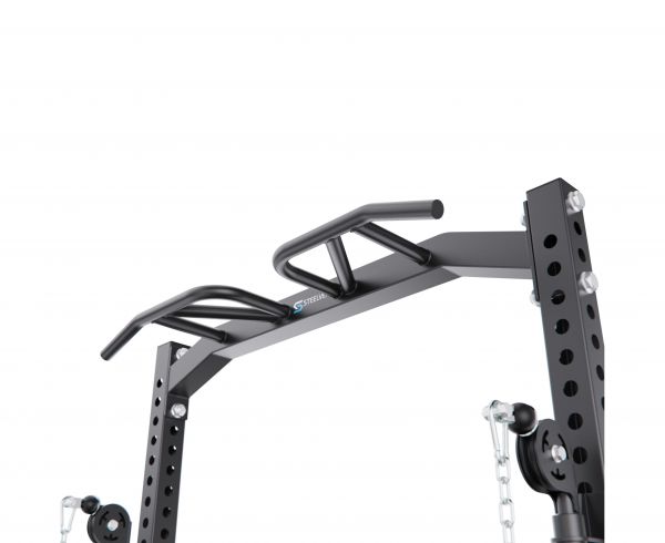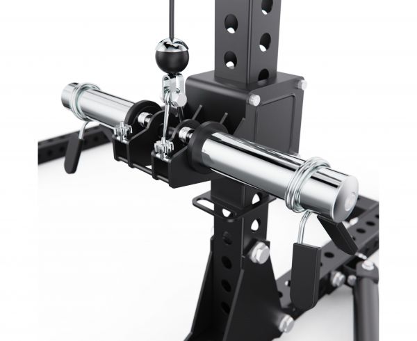 Встроенный кроссовер расширяет функциональность тренажера, позволяя прорабатывать все основные группы мышц. Кроме того, с одной стороны рамы предусмотрено специальное отверстие для установки грифа, которое позволяет использовать раму как Лэндмайн, выполняя жим и другие упражнения с естественной амплитудой движения.