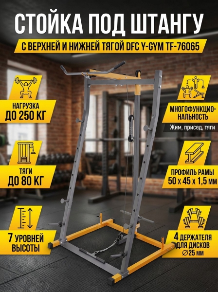 Стойка для штанги, тяга сверху и снизу DFC Y-GYM - многофункциональная стойка для домашних тренировок. Серия Y-GYM – это тренажеры в современном дизайне, где динамичный желтый цвет гармонично сочетается с элегантным черным. Продуманная геометрия и контрастное цветовое решение позволят тренажеру гармонично вписаться в любую комнату и стать ярким акцентом вашего интерьера. Это идеальное решение для тех, кто ценит функциональность и эстетику в каждой детали своего дома.