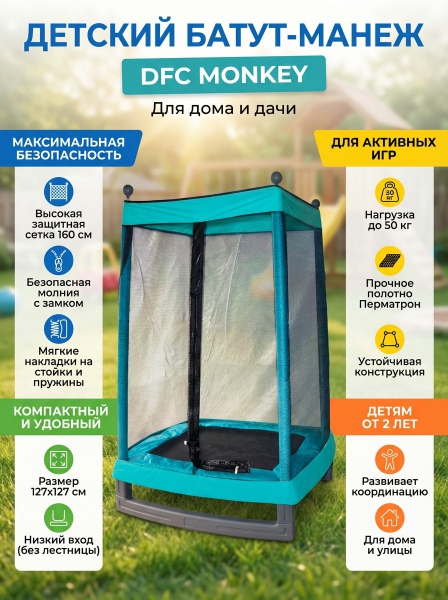 Детский батут DFC MONKEY сине-зелёного цвета предназначен для домашнего использования. Имеет компактные размеры и оснащён защитной сеткой. Батут выполнен в необычном, ярком лазурном цвете. Он поднимает настроение и привлекает внимание детей всех возрастов.