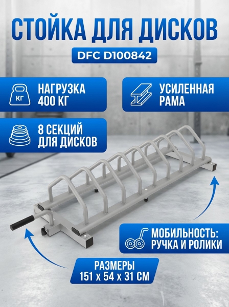 Напольная стойка для хранения дисков DFC D100842 – удобный мобильный органайзер для домашнего спортзала. Стойка выдерживает нагрузку до 400 кг, на ней можно хранить до 8 пар дисков любого диаметра. Надежность стойки обеспечивает профиль рамы, выполненный из высокопрочной стали. Удобная ручка и ролики позволяют легко транспортировать стойку. Храните снаряды там, где вам удобно и переносите на время тренировок.