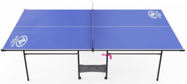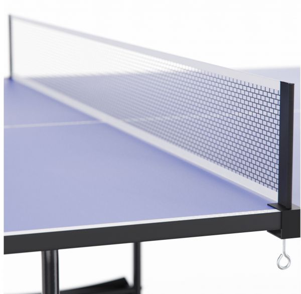 Столешница выполнена прочных металлических элементов с ножками диаметром 25 мм, что гарантирует устойчивость и безопасность в процессе игры. Такая конструкция выдерживает интенсивные нагрузки и подходит для регулярного использования. Толщина столешницы 15 мм, что обеспечивает хороший и предсказуемый отскок мяча. Синий цвет поверхности выглядит ярко и стильно, а защитный кант по периметру предохраняет края столешницы от повреждений и продлевает срок службы.
