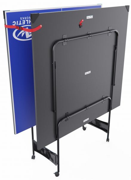 Конструкция стола состоит из 4-х частей, при этом стол складывается наполовину, что позволяет играть в одиночку и экономит место при хранении. В сложенном виде он занимает минимум места, что делает хранение и транспортировку максимально удобными. Для удобства перемещения стол оснащён четырьмя транспортировочными роликами с фиксаторами. Это позволяет легко перемещать его по дому или площадке и надёжно фиксировать в нужном положении.