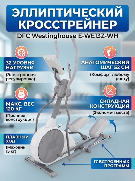 Эллиптический тренажёр DFC Westinghouse E-WE13Z-WH белого цвета — это мощный и удобный кардио тренажёр, созданный специально для домашнего использования. Он обеспечивает полноценную аэробную нагрузку на все группы мышц без ударной нагрузки на суставы, помогает сжигать калории, развивать выносливость и улучшать сердечно-сосудистую систему.